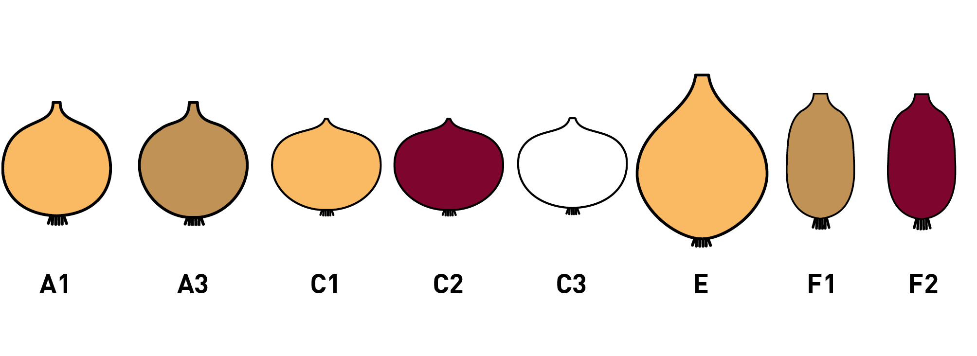 | Variety | Type | Growing period from sowing (days) * | Skin color | Bulb shape | Dry matter % | Bulb weight (g) | Storage (1 - 10) 1=very short 10=very long | Recommended sowing rate (UNIT/ha) 1 UNIT = 250 000 s |