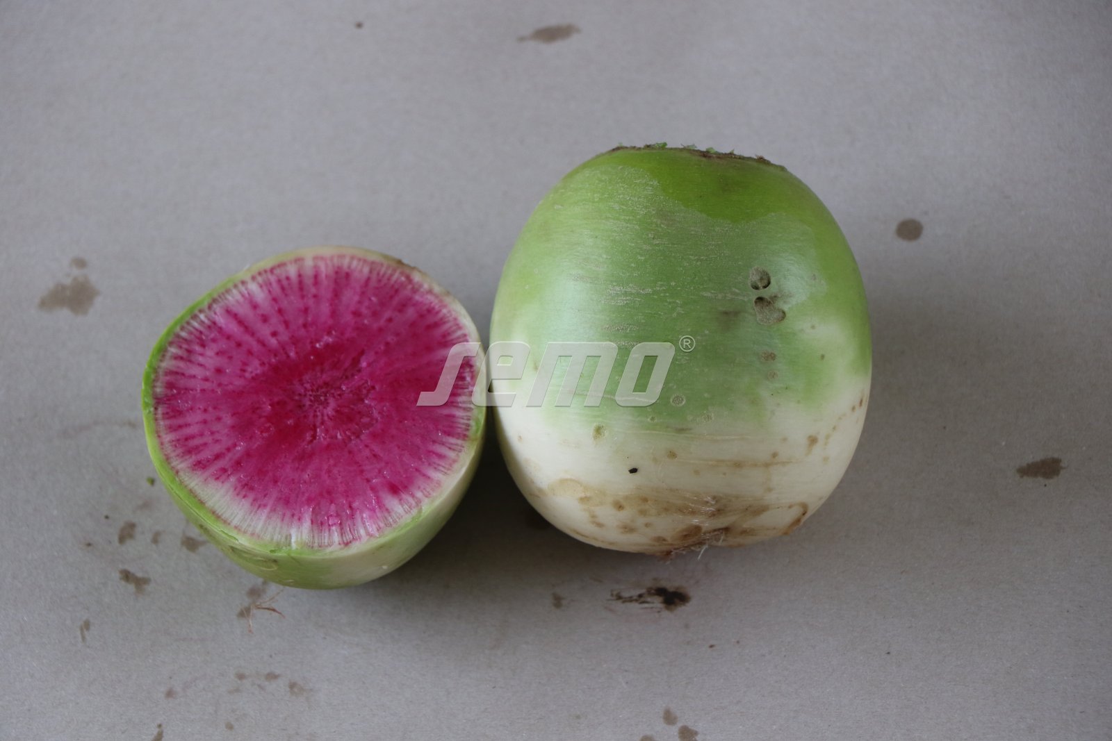 A summer radish with highly attractive purplishred flesh. The roots are oval to round in shape, white in color with a green neck. They measure approximately 10 cm in diameter and about 15 cm in length. The juicy and crispy pink flesh offers a fairly sweet taste. The roots are suitable for both transport and storage. Approximately 65 days from sowing to harvest.