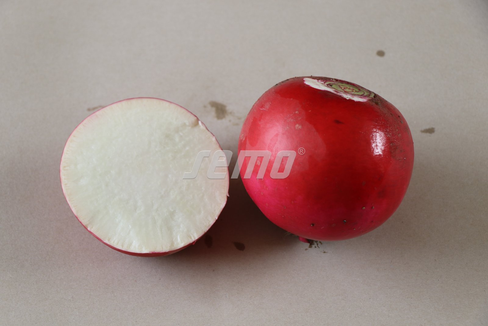 An almost round radish that immediately stands out with its attractive red skin and nearly spherical shape. The flesh is snow-white, crisp, juicy, and slightly sweet. RUBIN stores exceptionally well and, thanks to its strong resistance to bolting, is suitable for late spring sowing. Approximately 80 days from sowing to harvest.