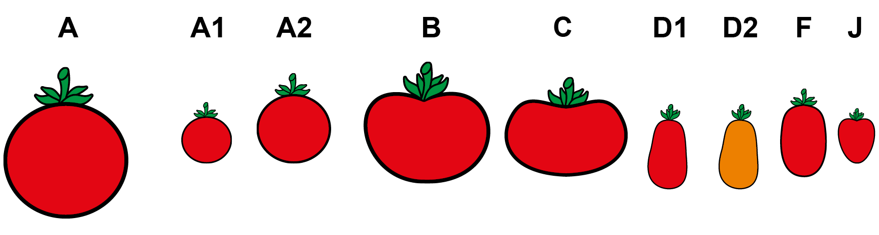 | TIGRINO | early | medium high | round "tiger" A2 | medium | medium | 25 | 8 | medium | HR | HR | HR | green and brown stripes, about 14 fruits per cluster high resistanece to Nematodes | ||||||||